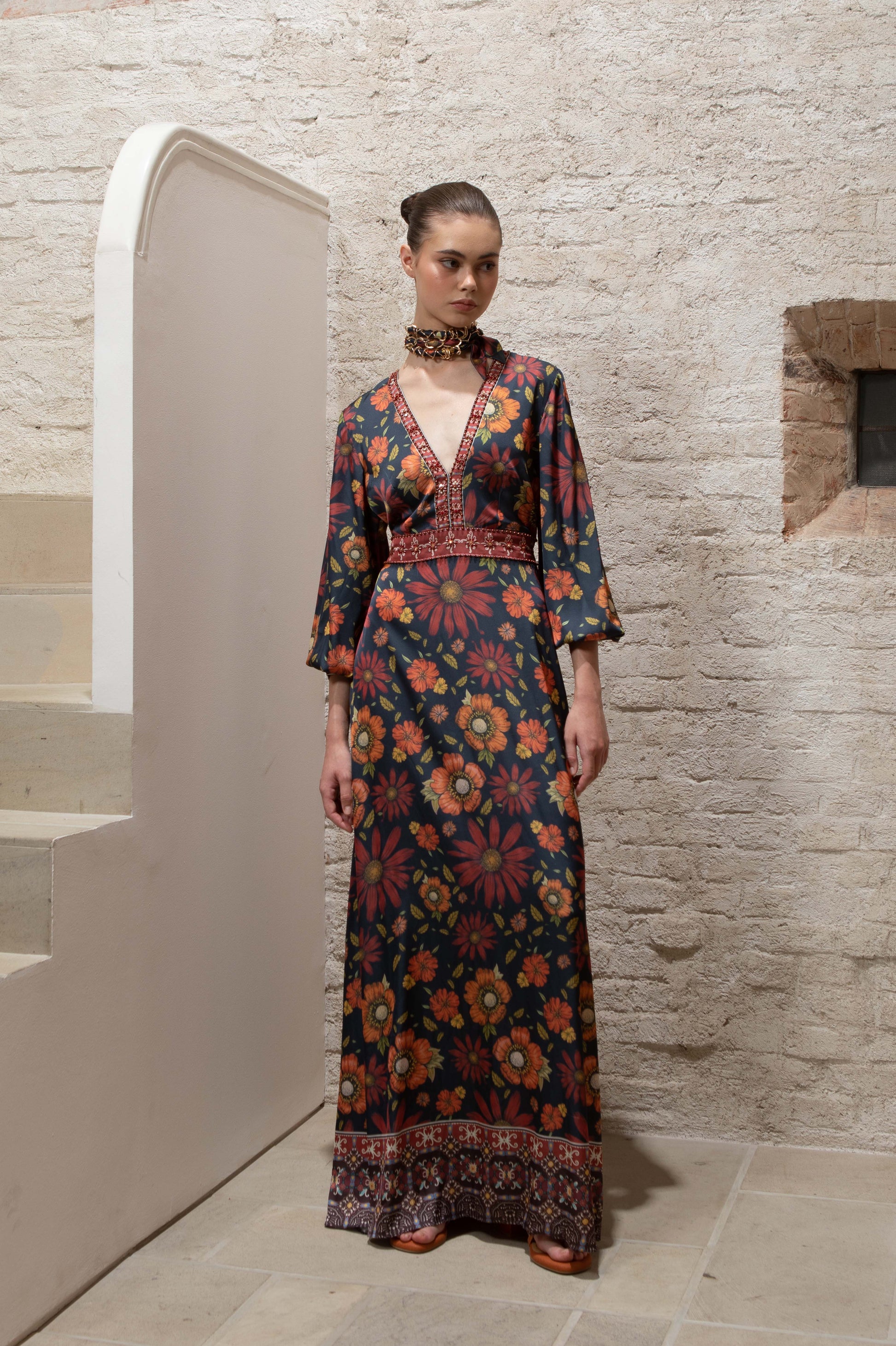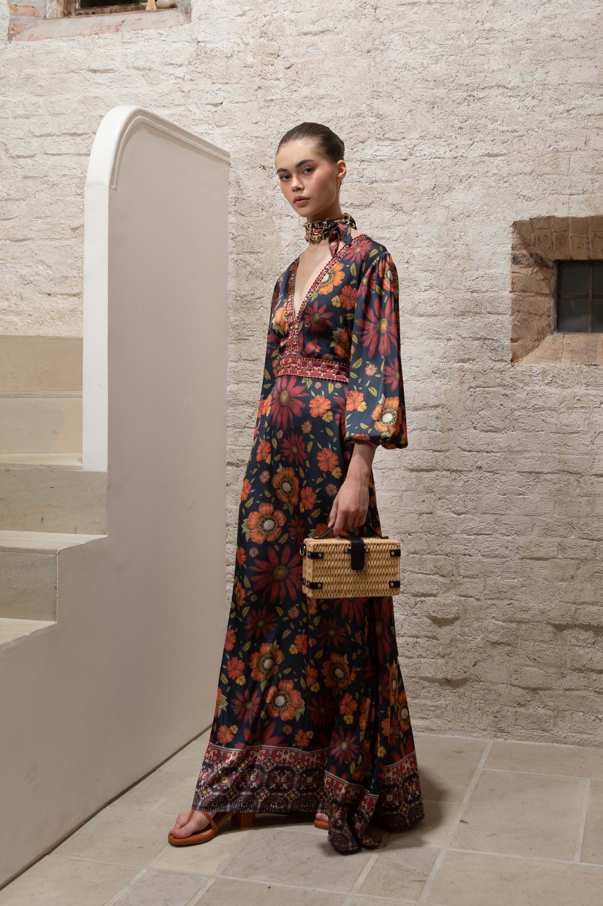 VT 8630 Rona V-Neck Ankle Dress with Puffed Sleeve in Navy
