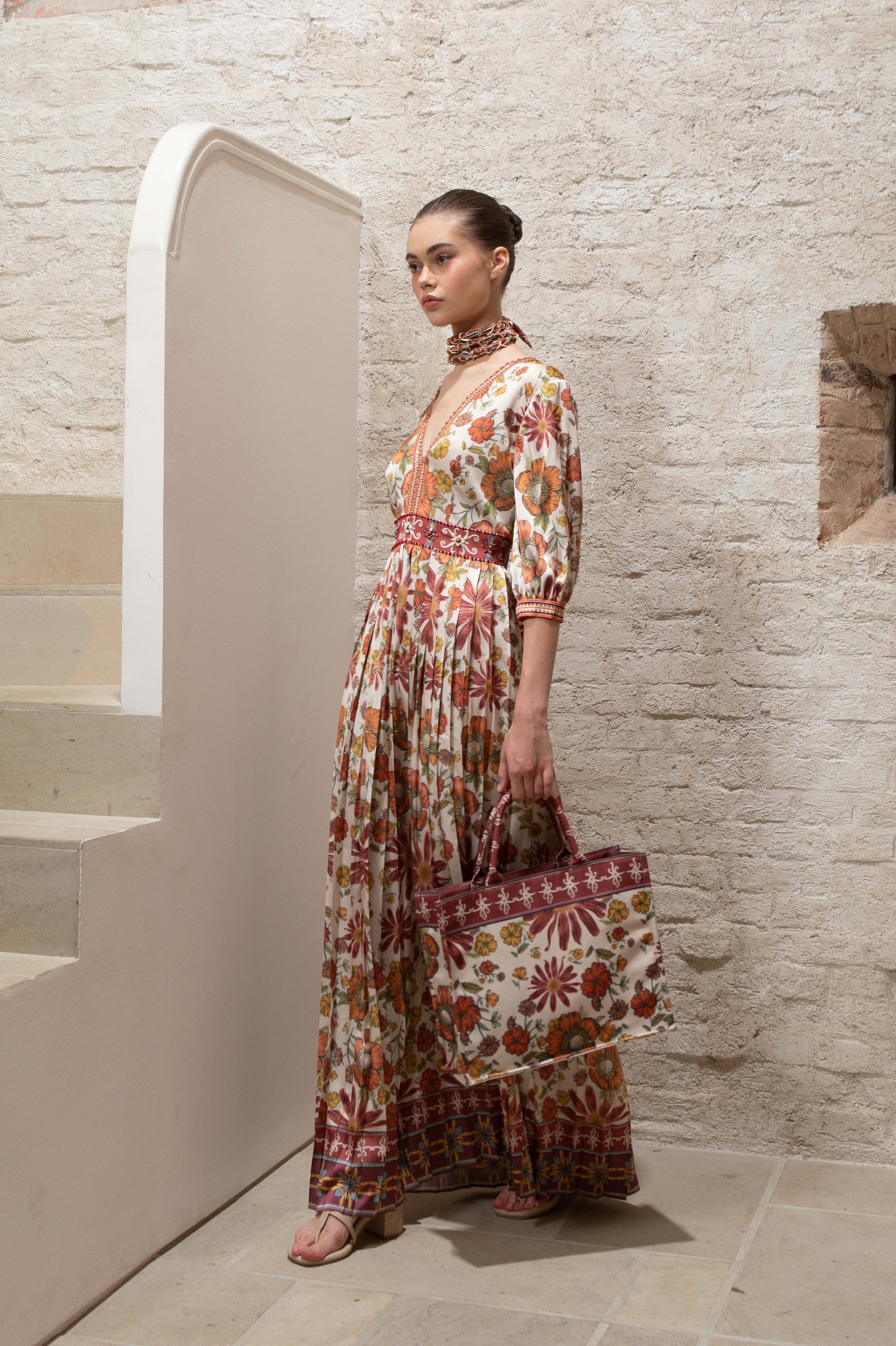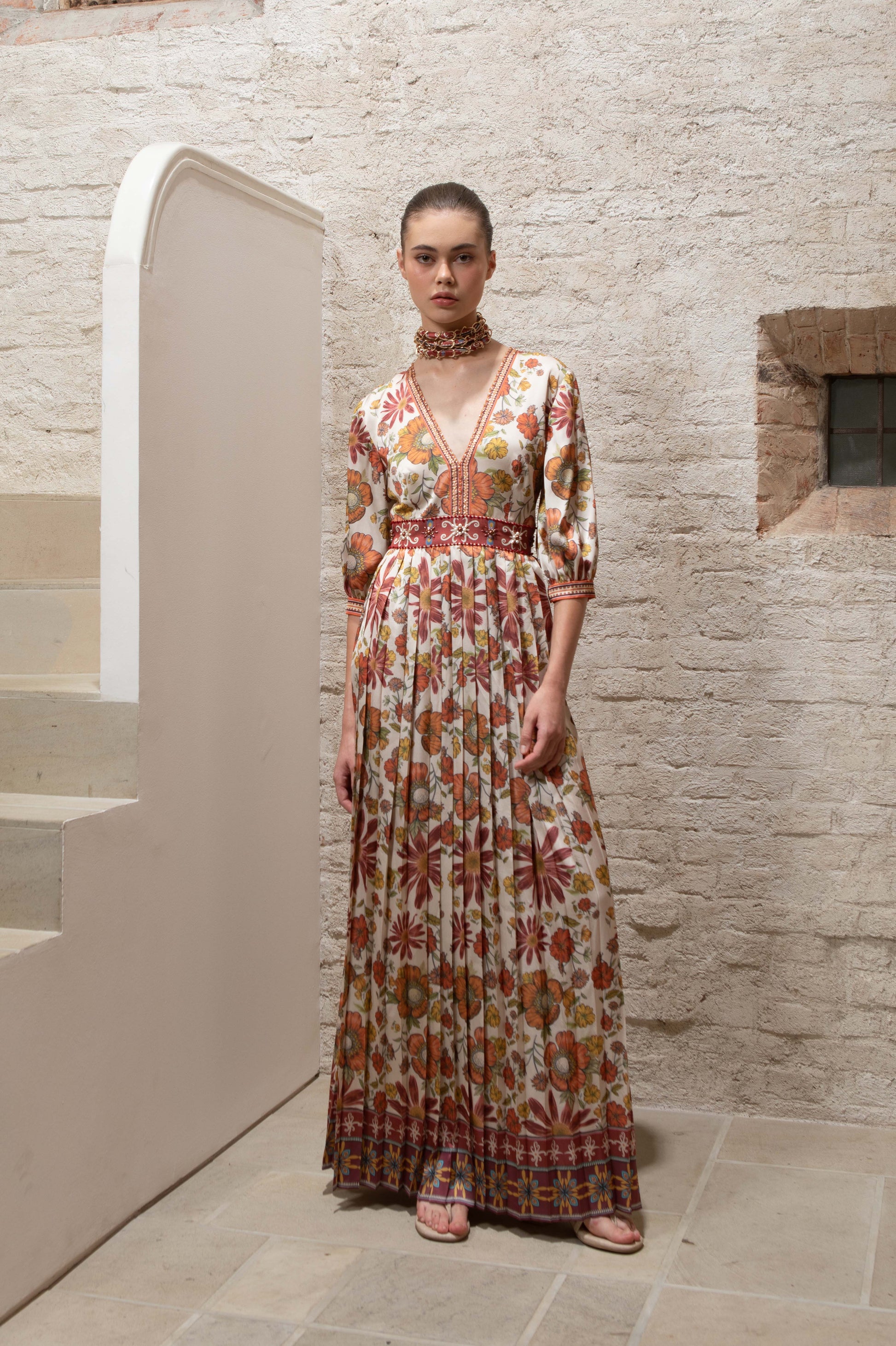 VT 8639 Rona Pleated Satin Ankle-dress in Ecru