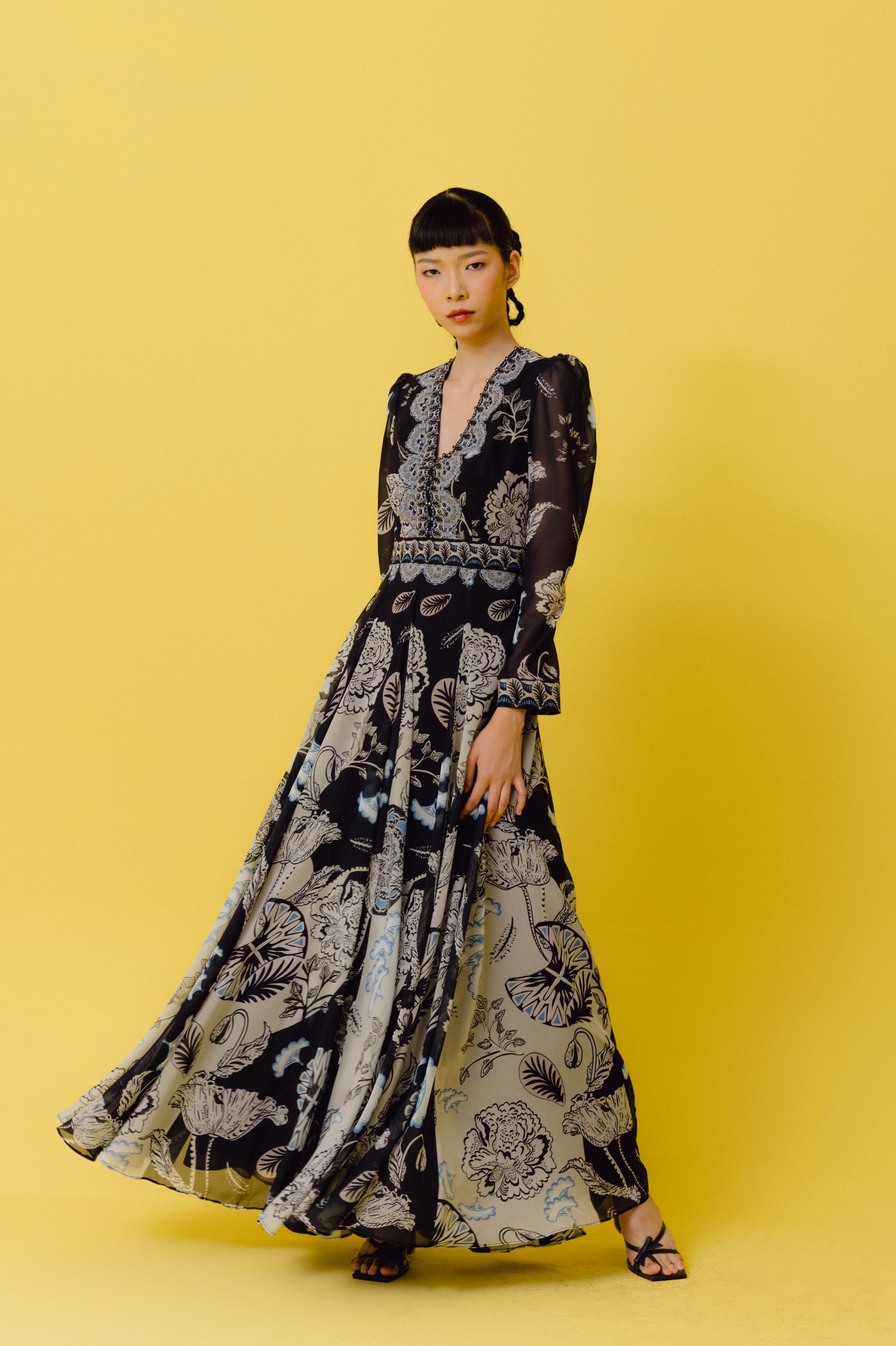 VT 8706 AN Chiffon Gored Long-dress in Navy
