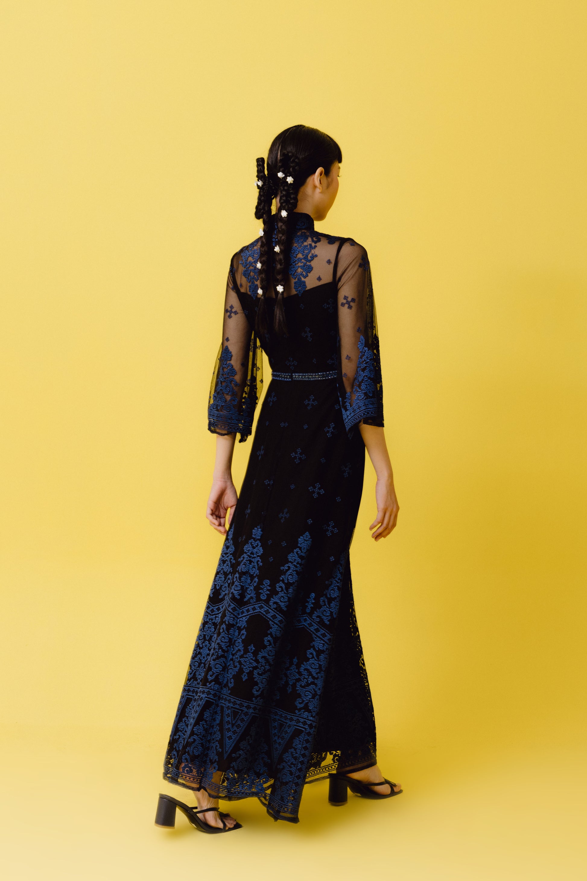 VT 8709 Black Tulle ankle dress with Navy Embroidery