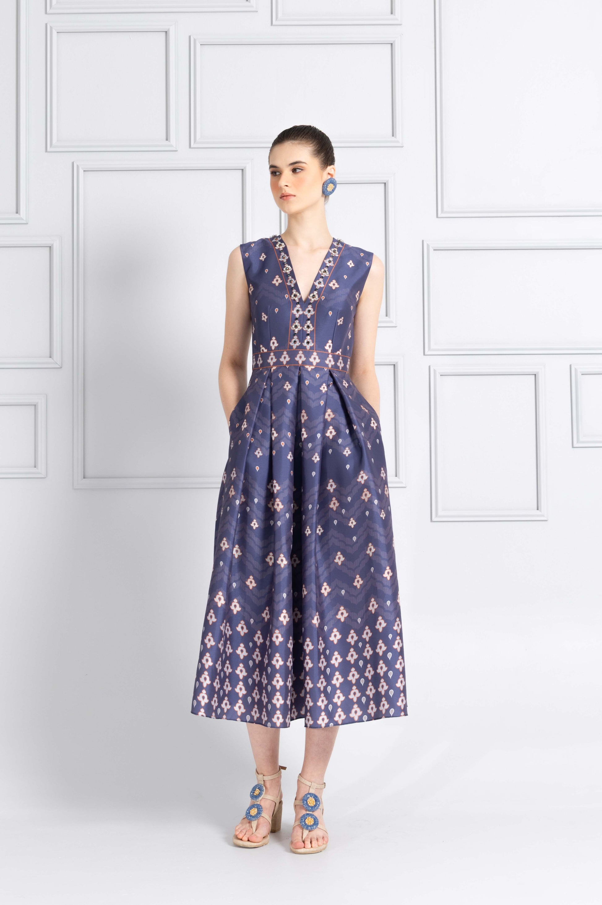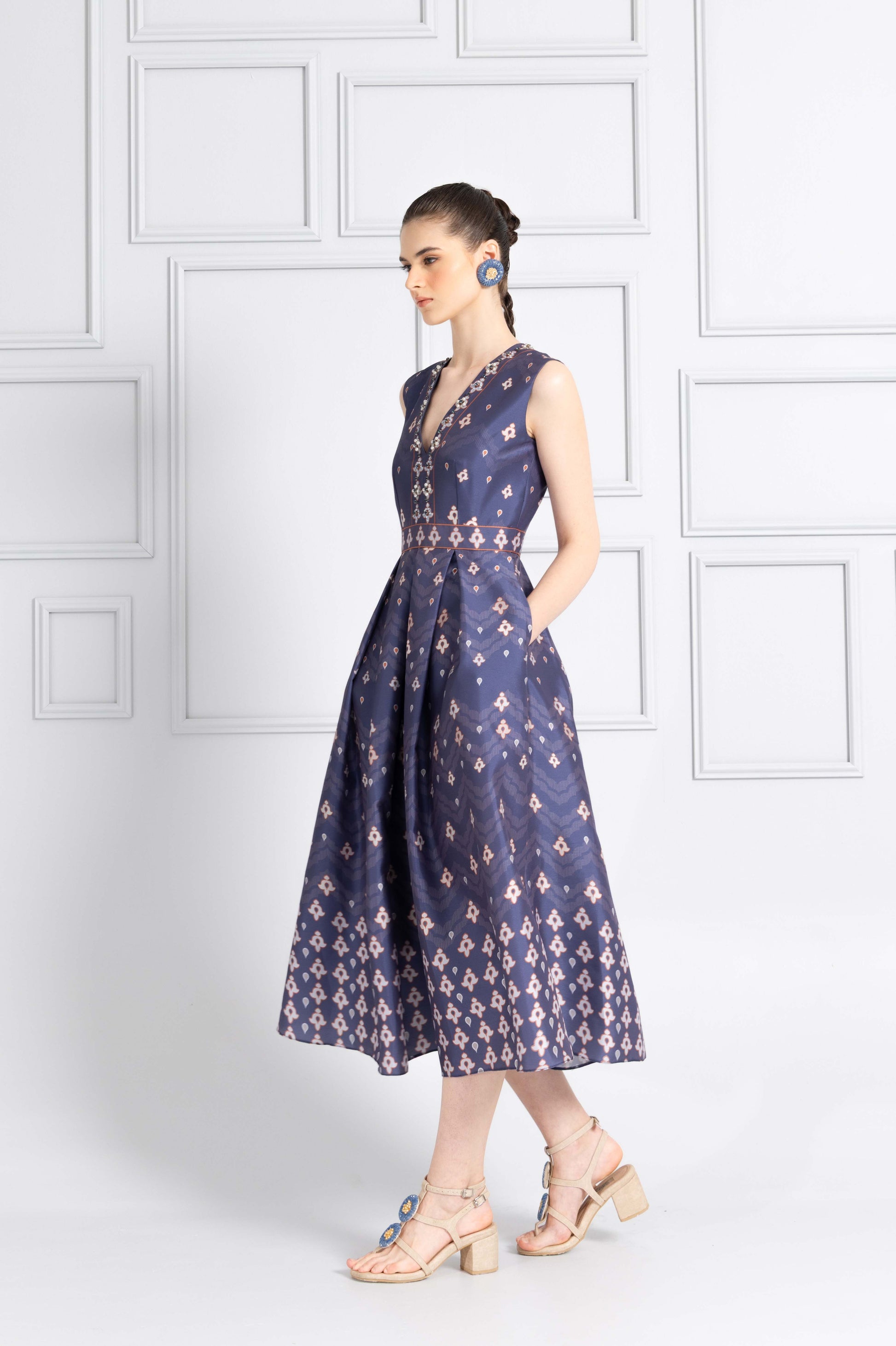 VT 8744-1 Danum Shantung Pleated Midi-dress in Blue